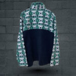 A color-block fleece pullover featuring a striking geometric pattern on the upper half and a solid navy blue on the bottom.