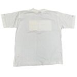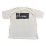 White T-Shirt with Mercedes-Benz Print: This is a white, short-sleeved t-shirt with a ribbed crew neck. The front features a large, rectangular photographic print of a car. The car is a vintage black Mercedes-Benz sedan, likely a W201 model (190E), seen from a side profile. The background of the photo includes a brick building and a doorway. The print is a realistic photograph, giving the shirt a retro, automotive-themed aesthetic. The shirt appears to be made from a comfortable cotton or cotton-blend fabric.