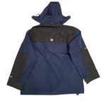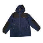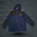 This is a versatile, two-tone Timberland jacket perfect for outdoor adventures or everyday wear. The jacket has a durable, water-resistant navy blue body with contrasting black panels on the shoulders and sleeves. It’s built for functionality with a full zip-up front and snap-button storm flap, a convenient hood, and two large front flap pockets for secure storage. The classic Timberland tree logo is embroidered on the chest. Adjustable cuffs and a sturdy construction make this a reliable piece of outerwear for various weather conditions.
