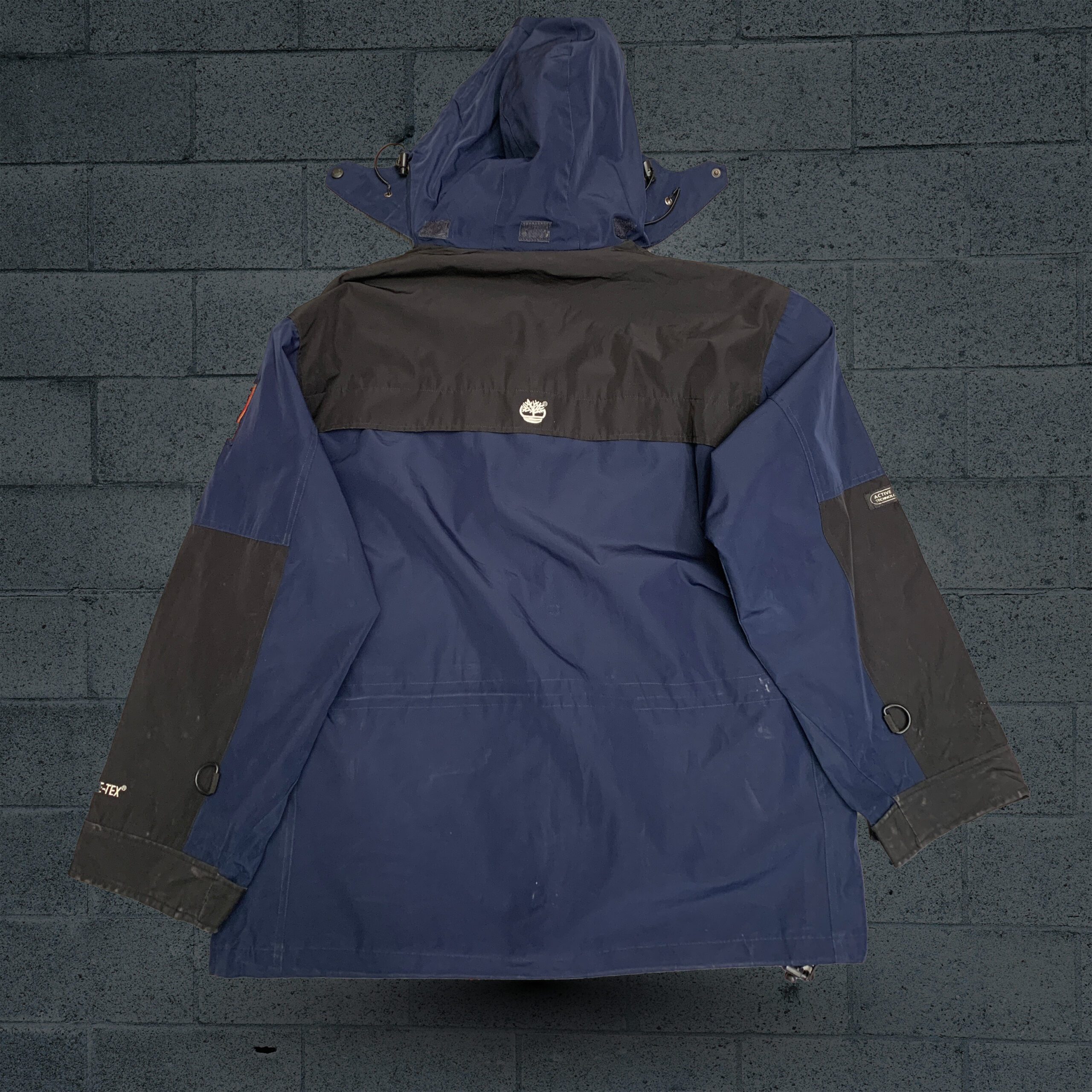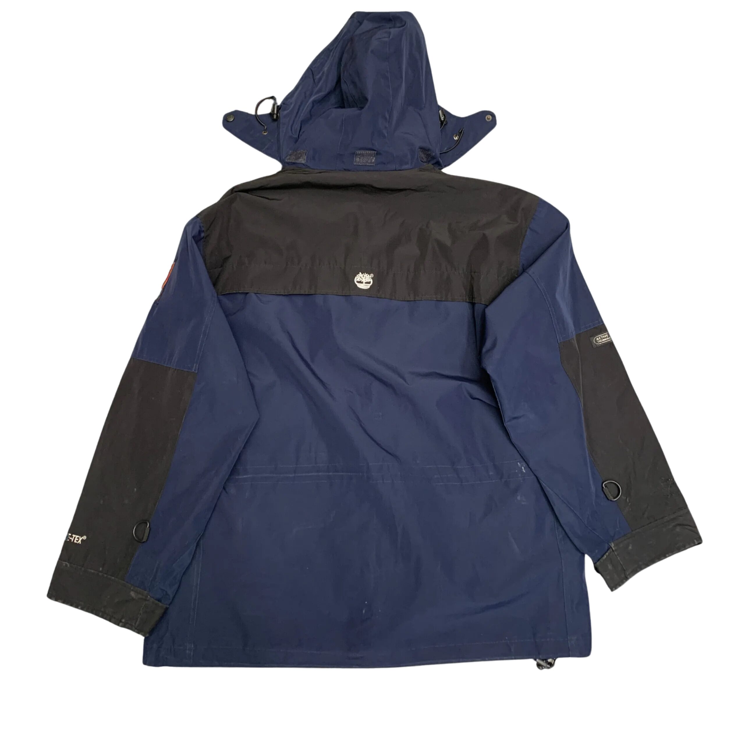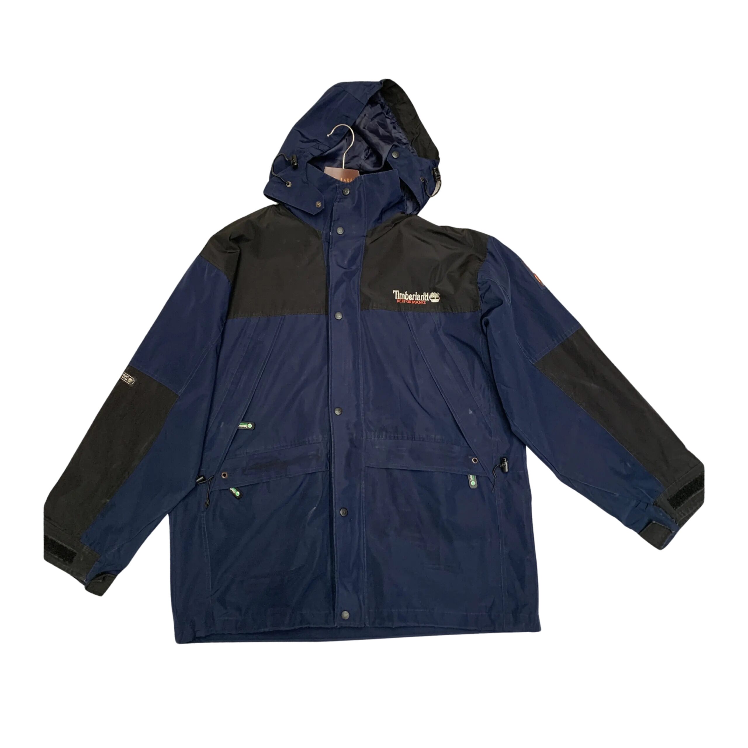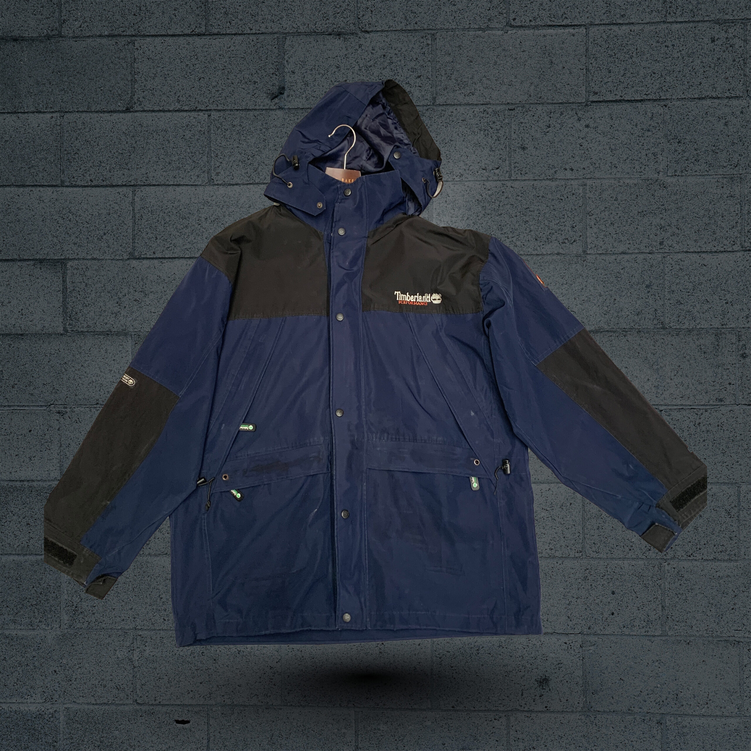 A two-tone Timberland jacket in navy blue and black. This technical jacket features a hood, multiple front pockets, and the classic embroidered Timberland logo on the chest.