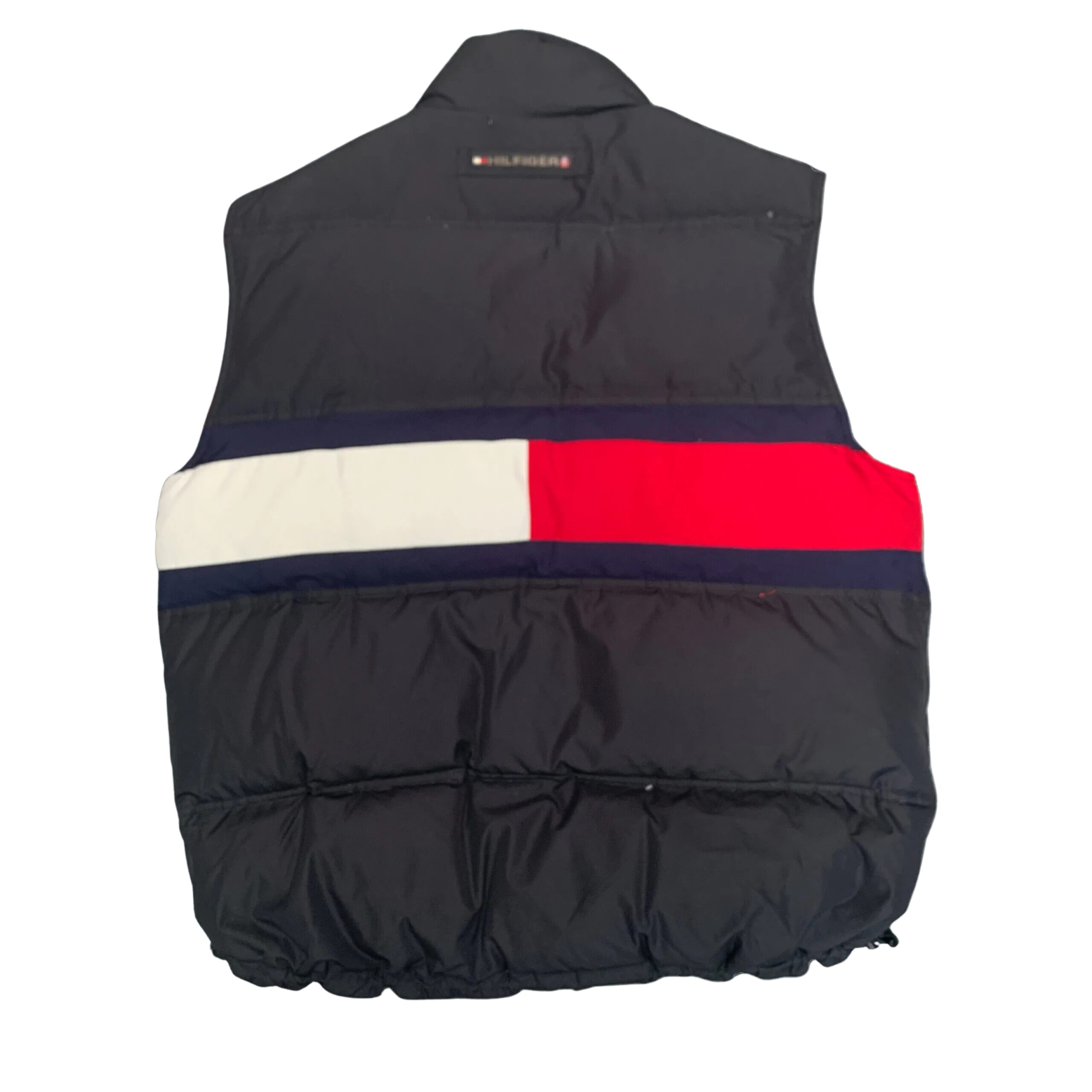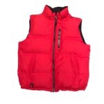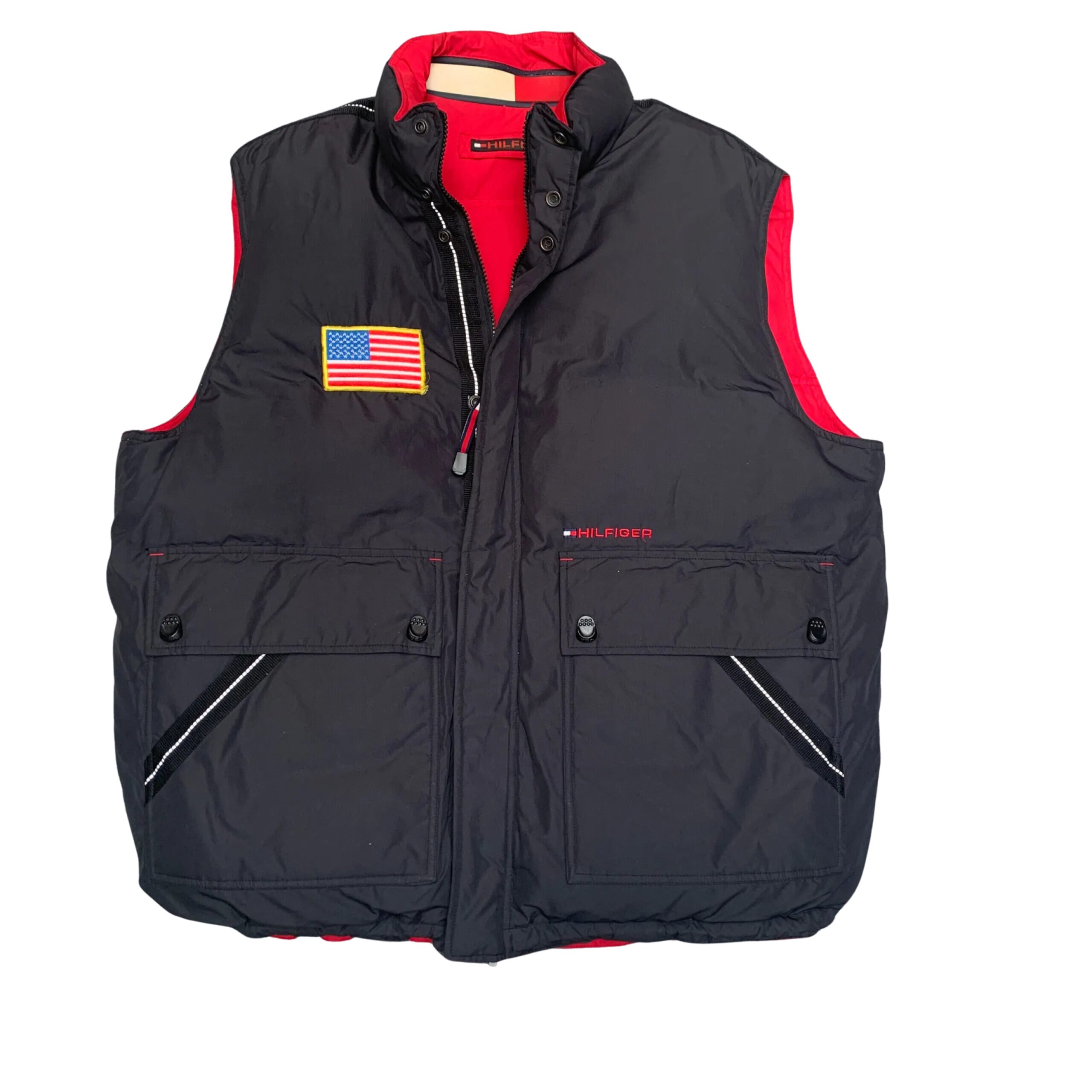 This eye-catching vintage Tommy Hilfiger puffer vest is a bold layering piece for any cold-weather look. The vest has a bright red outer shell with a subtle black inner lining and collar. It’s designed for warmth and style with a full front zipper, a zip pocket on the chest with vertical Tommy Hilfiger branding, and two convenient side pockets. The vest is finished with an embroidered logo at the hem. Its puffy, insulated design makes it a versatile and classic piece for adding a pop of color and warmth.