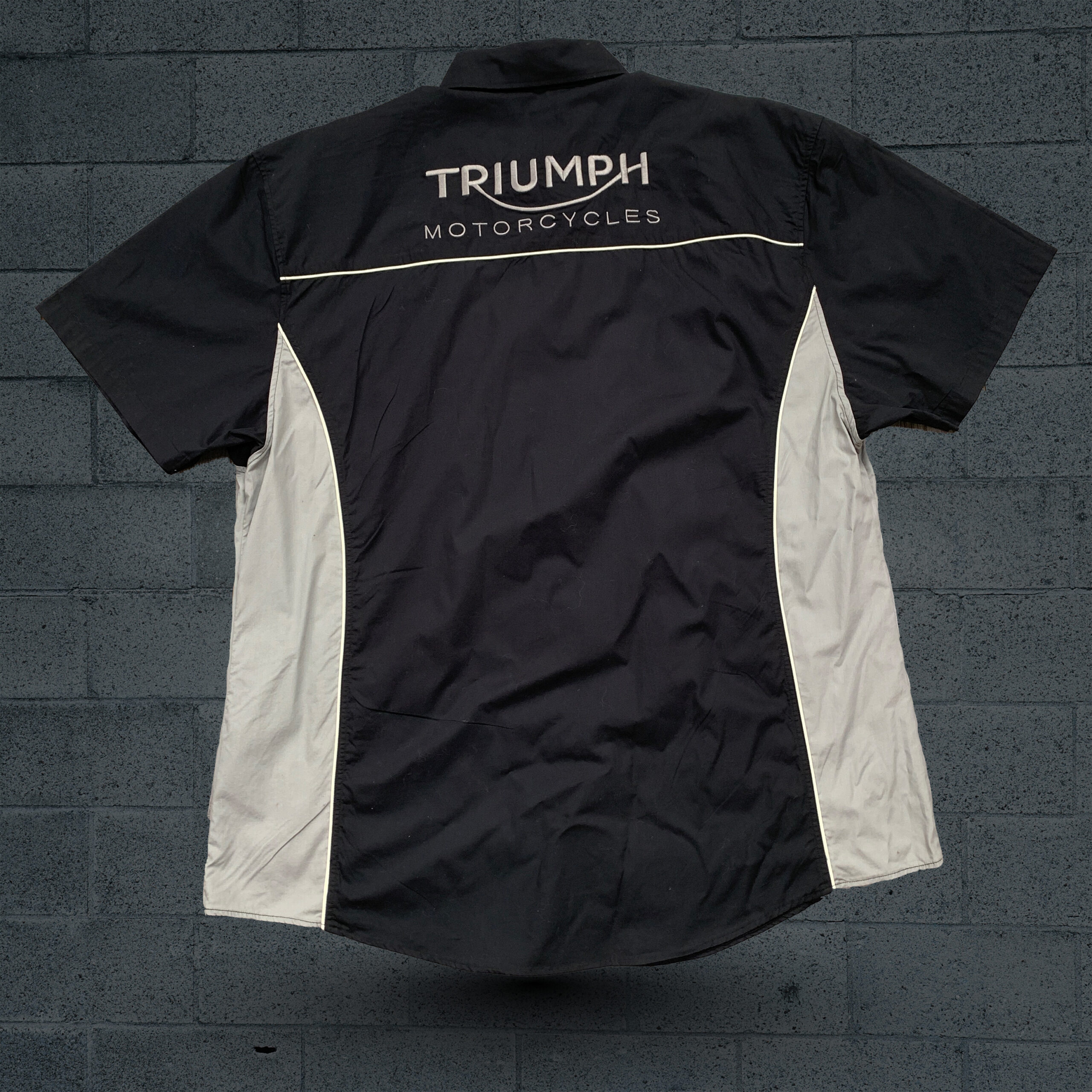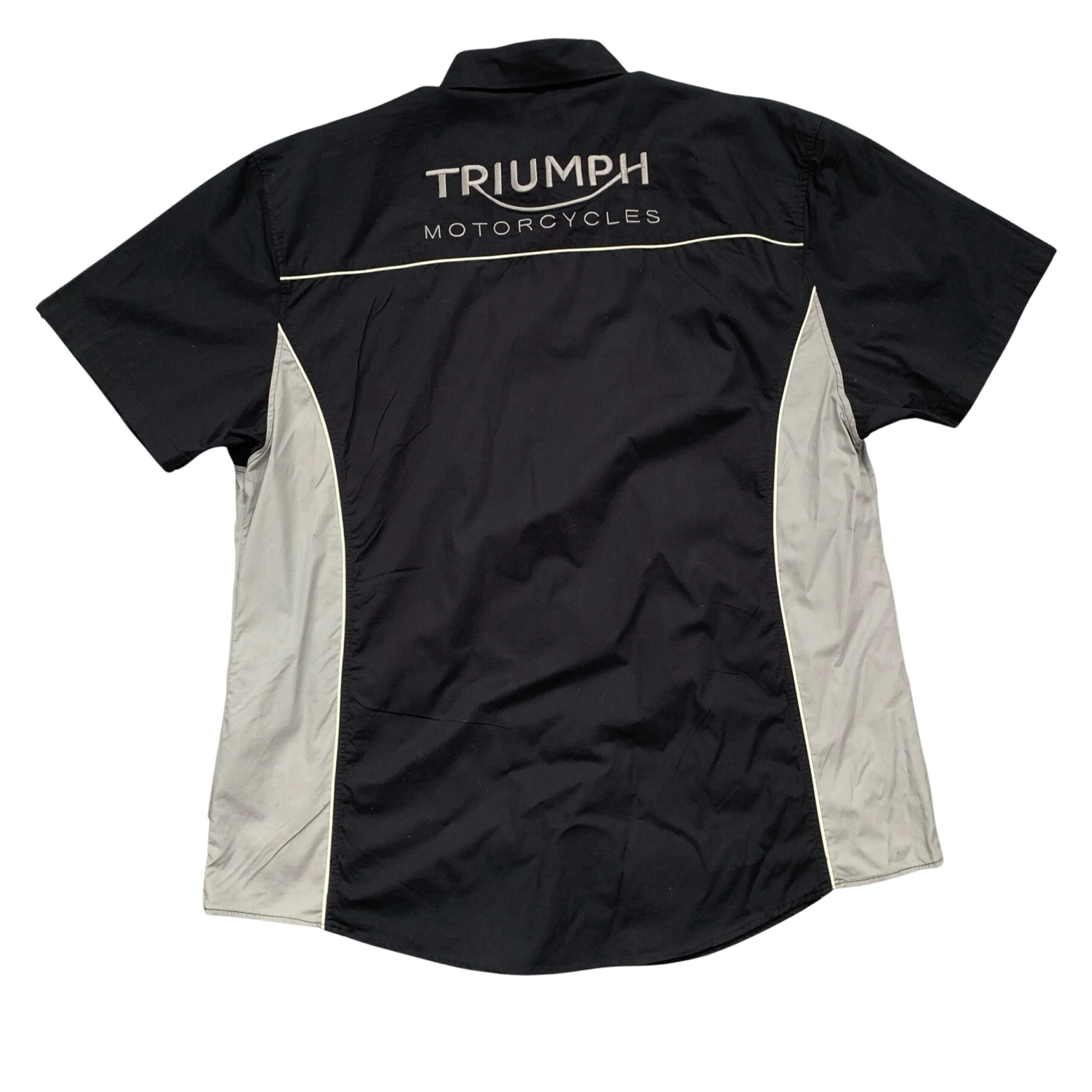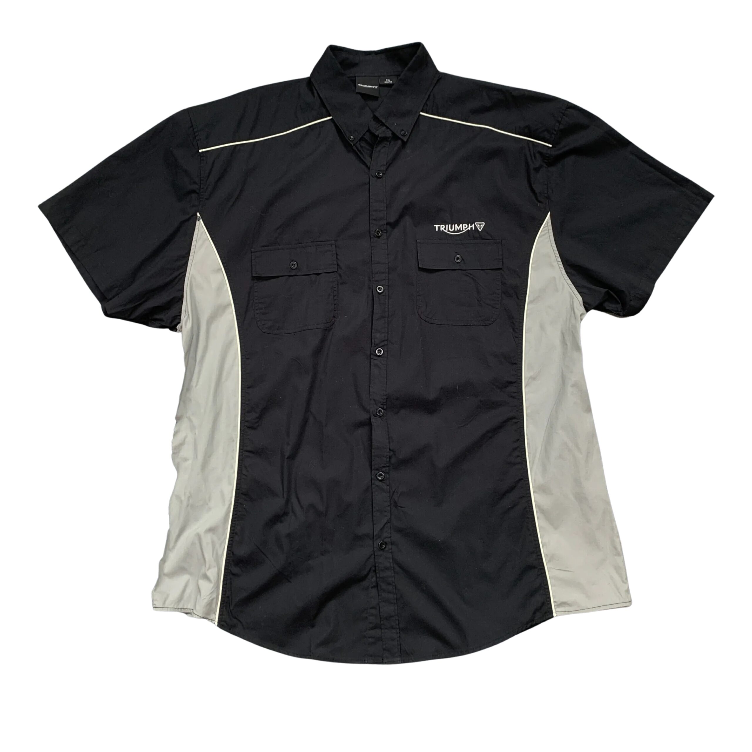 This is an authentic Triumph Motorcycles short-sleeve button-up work shirt (sometimes called a mechanic or service shirt). The main body is a durable black fabric, accented by light grey or silver side panels running from the armpit down to the hem. The shirt features striking white piping that separates the black and grey sections on the front and runs across the top of the chest and shoulders. It has a classic button-down collar, a full-button front closure, and two button-closure chest pockets. The Triumph logo (the “T” insignia and wordmark) is embroidered in white on the left chest pocket area. The style is reminiscent of vintage motor racing or garage apparel, making it a great piece for a Triumph enthusiast.