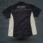 Vintage-style Triumph Motorcycles service shirt in black with contrasting grey side panels and white piping, featuring the Triumph logo embroidered on the chest.