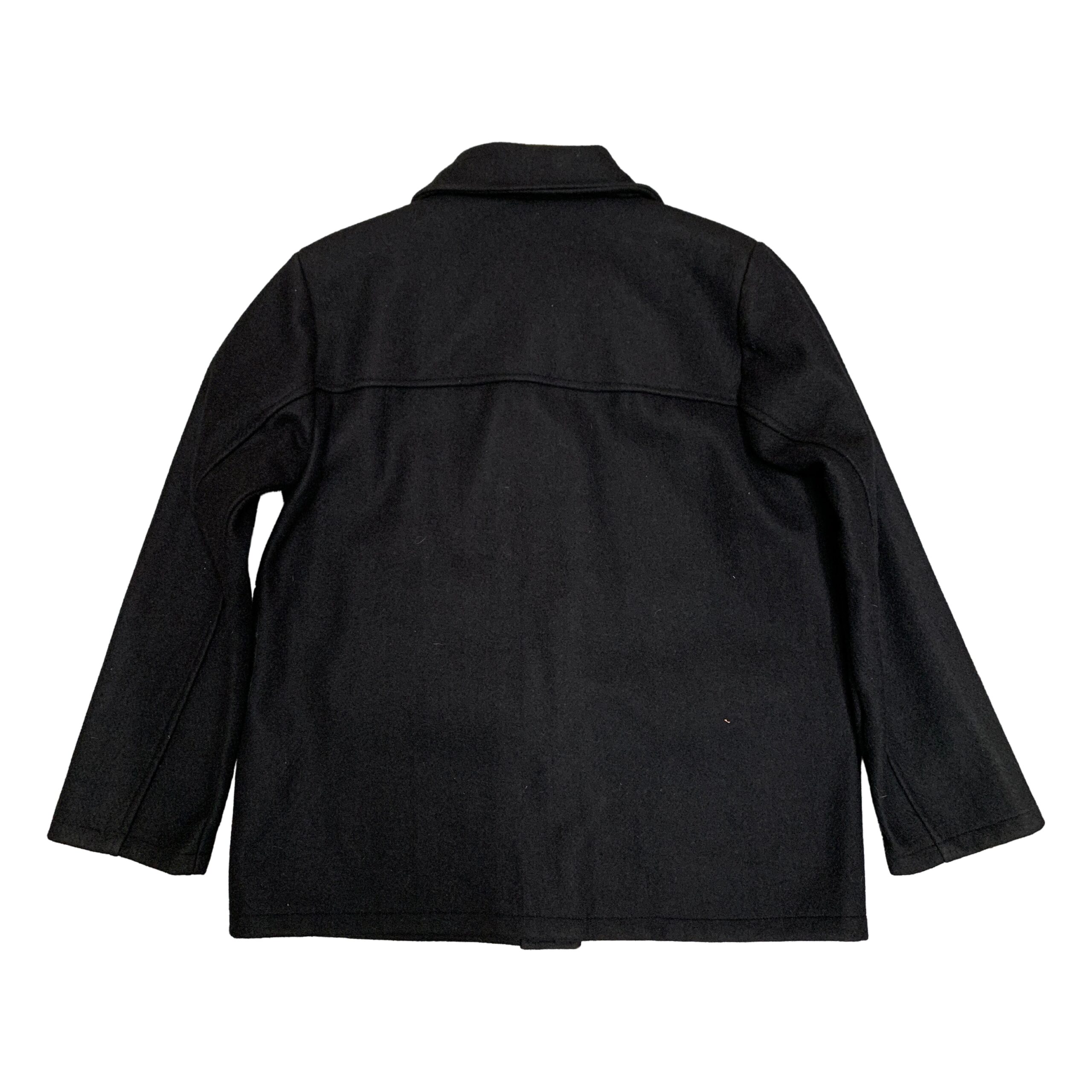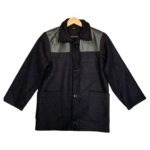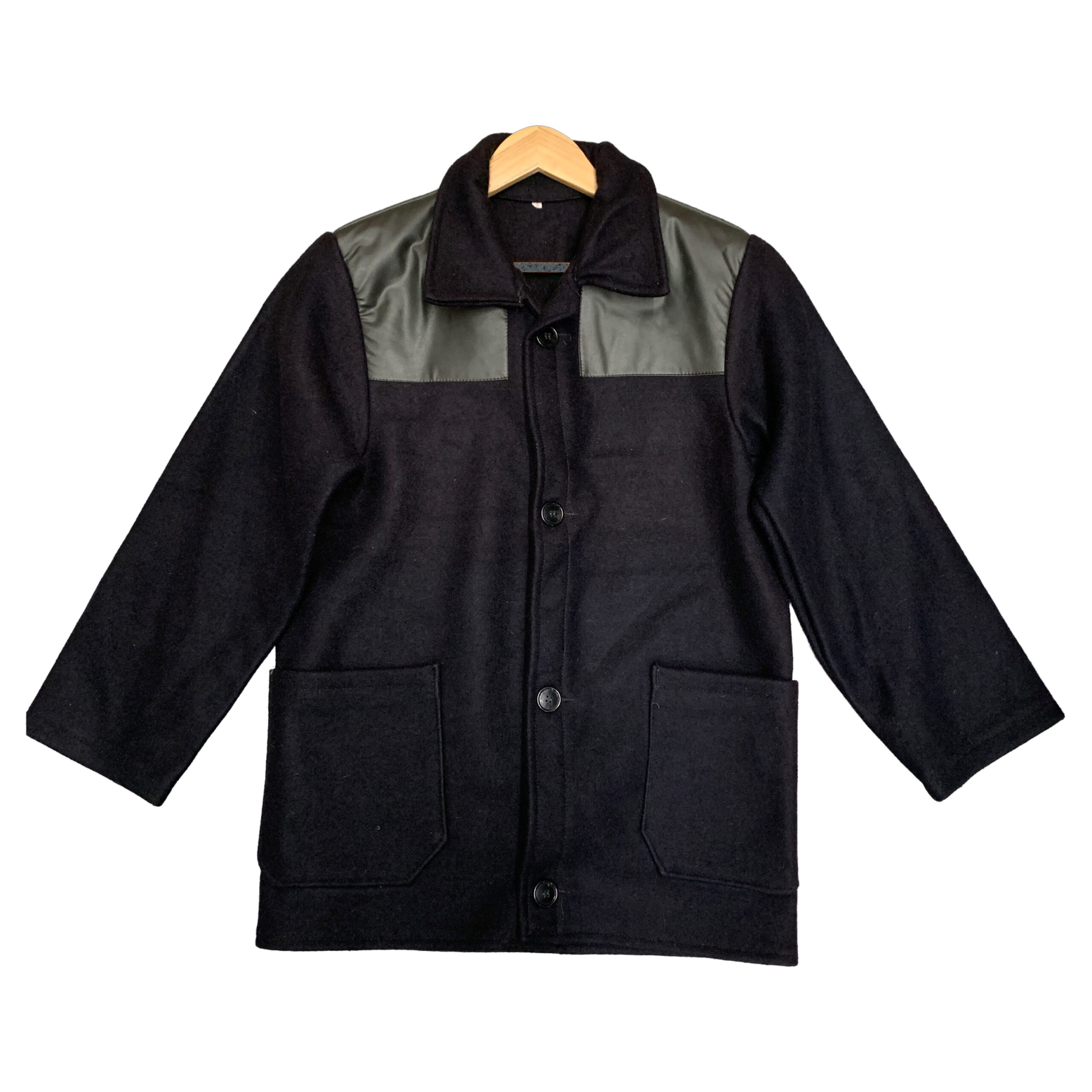 This Donkey jacket combines classic wool craftsmanship with modern detailing. Made from rich black wool, it features sleek Black leather panels along the sides for a stylish contrast. The design includes a four-button front closure, two practical side pockets, and long sleeves for a structured fit. A clean, minimalist workwear and versatile design.