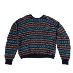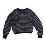This is a multicolored sweater with a geometric pattern against a grey brick wall. It has dark blue accents on the collar and cuffs.