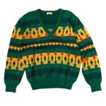 This is a green sweater with a festive yellow and red pattern. It’s laid flat against a dark grey brick wall.