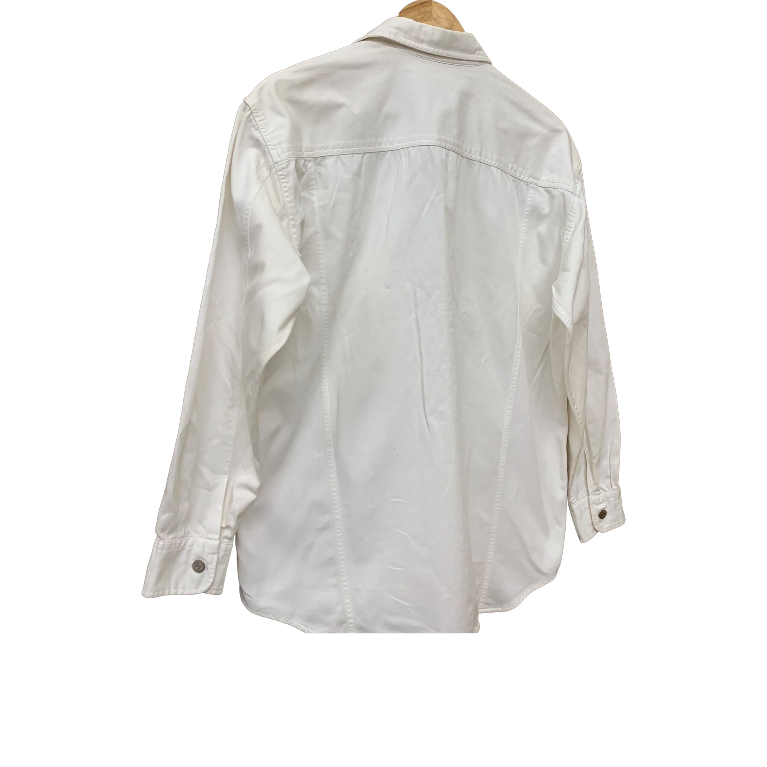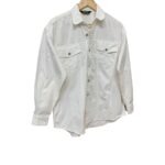This crisp white WEAR ZONE shirt is crafted from a durable cotton fabric, likely a white denim or sturdy twill, offering a clean and versatile aesthetic. It features a classic point collar and a full front closure secured by what appear to be silver-toned metal snap buttons, adding a touch of utility-inspired detail. Two functional chest pockets with buttoned flaps are present, each reinforced with small metal rivets, reminiscent of traditional denim workwear. The shirt is designed with long sleeves ending in buttoned cuffs and a curved shirttail hem, making it suitable for both tucked-in and untucked styles. Visible topstitching further enhances its structured design, making it a timeless and adaptable piece for various casual or smart-casual ensembles.